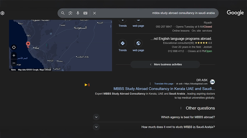 Dr Ask achieved the #1 ranking on Google for the keyword “mbbs study abroad consultancy in saudi arabia”