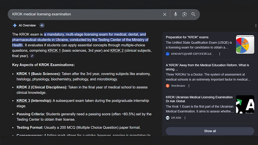 Dr Ask achieved AIO ranking on Google for the keyword “KROK medical licensing examination”